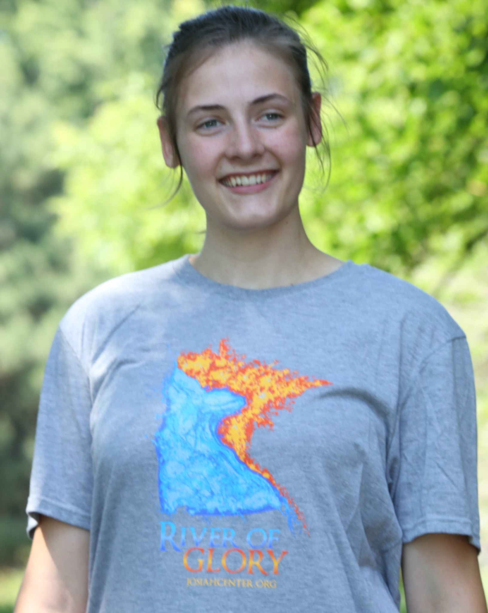 River of Glory short-sleeved t-shirt is by Anvil. Tri-blend material. Adult sizes only. Runs a little small.